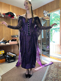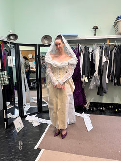 In Undergrad, as part of coursework and production work, Vanessa worked on the undergarments for Gertrude and Ms. Malloy's main outfit for Ms. Malloy, designed by Nancy Hill. She patterned and draped Gertrude's bloomers and camisole and used a the Laughing Moon's pattern for the corset. And alongside fellow undergrad student Darian June, constructed Jacket and bustle for Ms. Malloy from given commercial pattern.